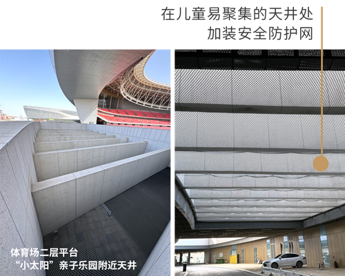 快樂(lè)成長(zhǎng),安全為先。為了確保兒童游樂(lè)區(qū)的安全,鄭州奧體中心從細(xì)節(jié)處著手精心加裝了多種防護(hù)裝置,在奧體中心西北角區(qū)域加裝隔離花箱、石墩,確保行人與機(jī)動(dòng)車(chē)分離。同時(shí),在體育場(chǎng)二層平臺(tái)兒童聚集較多的天井內(nèi),加裝防護(hù)網(wǎng);在健身器材一側(cè)加裝防護(hù)欄;在通往二層平臺(tái)的步梯兩側(cè)加裝防滑球......這些防護(hù)裝置均經(jīng)過(guò)嚴(yán)格的現(xiàn)場(chǎng)論證和質(zhì)量檢測(cè),確保其具有優(yōu)異的耐用性和穩(wěn)定性。通過(guò)這些措施,鄭州奧體中心致力于為孩子們打造一個(gè)既充滿樂(lè)趣,又安全無(wú)虞的游樂(lè)環(huán)境。