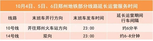 10月4日至6日,鄭州地鐵相關(guān)線路延長運(yùn)營服務(wù)時(shí)間,請(qǐng)您留意“鄭州地鐵”微信公眾號(hào)。