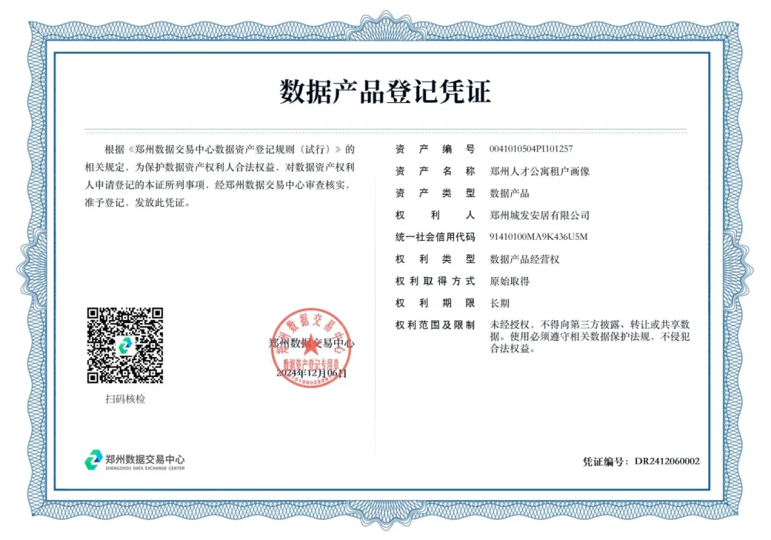 12月6日,鄭州城市發(fā)展集團(tuán)有限公司下屬子公司鄭州城發(fā)安居有限公司(以下簡(jiǎn)稱“城發(fā)安居”)在鄭州數(shù)據(jù)交易中心成功完成了“鄭州人才公寓租戶畫像”的資產(chǎn)登記,正式取得數(shù)據(jù)產(chǎn)品登記憑證,成為鄭州首例將人才公寓運(yùn)營數(shù)據(jù)資產(chǎn)入表的市屬國企。