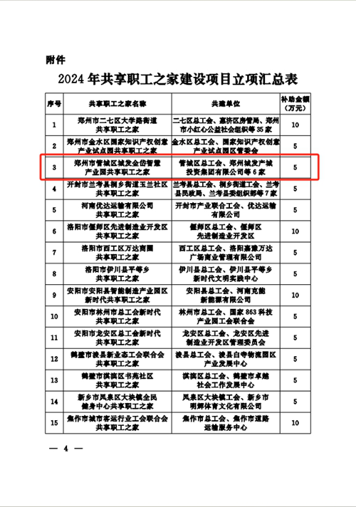 近日,河南省總工會(huì)發(fā)布《關(guān)于2024年共享職工之家建設(shè)項(xiàng)目立項(xiàng)的通知》,決定對(duì)城發(fā)金岱智慧產(chǎn)業(yè)園共享職工之家等32個(gè)共享職工之家建設(shè)項(xiàng)目進(jìn)行立項(xiàng),并對(duì)城發(fā)金岱智慧產(chǎn)業(yè)園共享職工之家給予資金補(bǔ)助,鄭州市僅有三家職工之家獲得立項(xiàng),這是城發(fā)金岱智慧產(chǎn)業(yè)園共享職工之家建設(shè)運(yùn)營(yíng)后取得的第一份殊榮。
