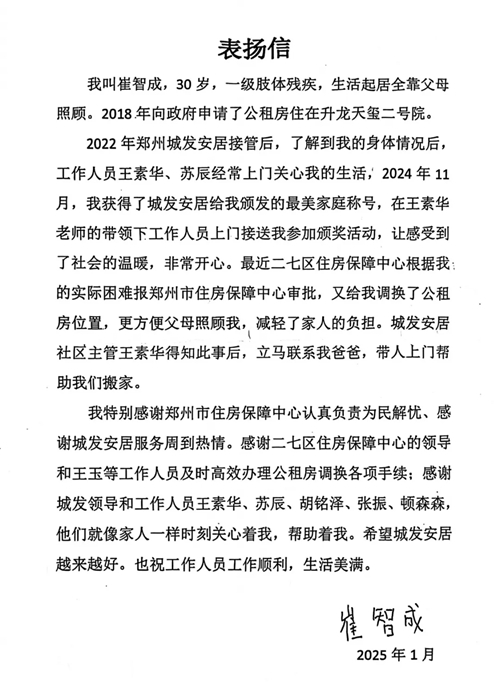 1月9日清晨,崔老師一家分別向住保中心、城發(fā)安居贈(zèng)送了錦旗,并送來(lái)一封表?yè)P(yáng)信,對(duì)住保中心所展現(xiàn)的認(rèn)真負(fù)責(zé)態(tài)度以及為民解憂(yōu)的卓越作風(fēng)表達(dá)了高度贊揚(yáng),同時(shí)也對(duì)城發(fā)安居工作給予了肯定鼓勵(lì)。
