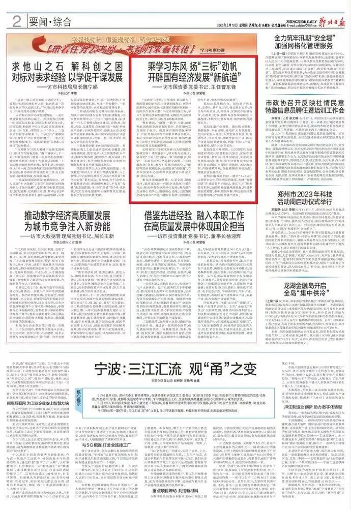 5月18日,《鄭州日報》刊發(fā)市國資委黨委書記、主任曹東鋒專訪文章《乘學(xué)習(xí)東風(fēng) 揚(yáng)“三標(biāo)”勁帆 開辟國有經(jīng)濟(jì)發(fā)展“新航道”》,為您全文分享如下——